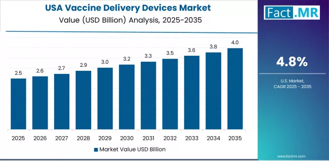 Revenue from vaccine delivery devices in the USA is projected to exhibit exceptional growth with a CAGR of 4.8% through 2035, driven by extensive vaccination infrastructure and rapidly growing adoption of safety-engineered solutions supported by pandemic preparedness and healthcare safety initiatives. The country's comprehensive immunization ecosystem and increasing investment in safety technologies are creating substantial demand for advanced delivery device solutions. Major healthcare systems and public health programs are establishing comprehensive device systems to serve both routine immunization and emergency response requirements.