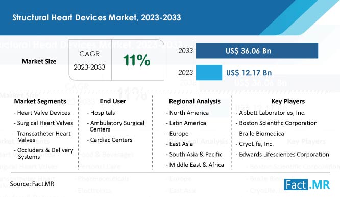 Increasing at an impressive CAGR of 11%, the global structural heart devices market is expected to increase from a valuation of US$ 12.17 billion in 2023 to US$ 36.06 billion by 2033-end.